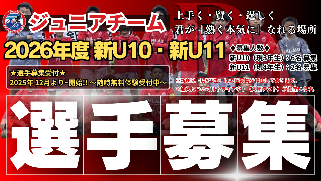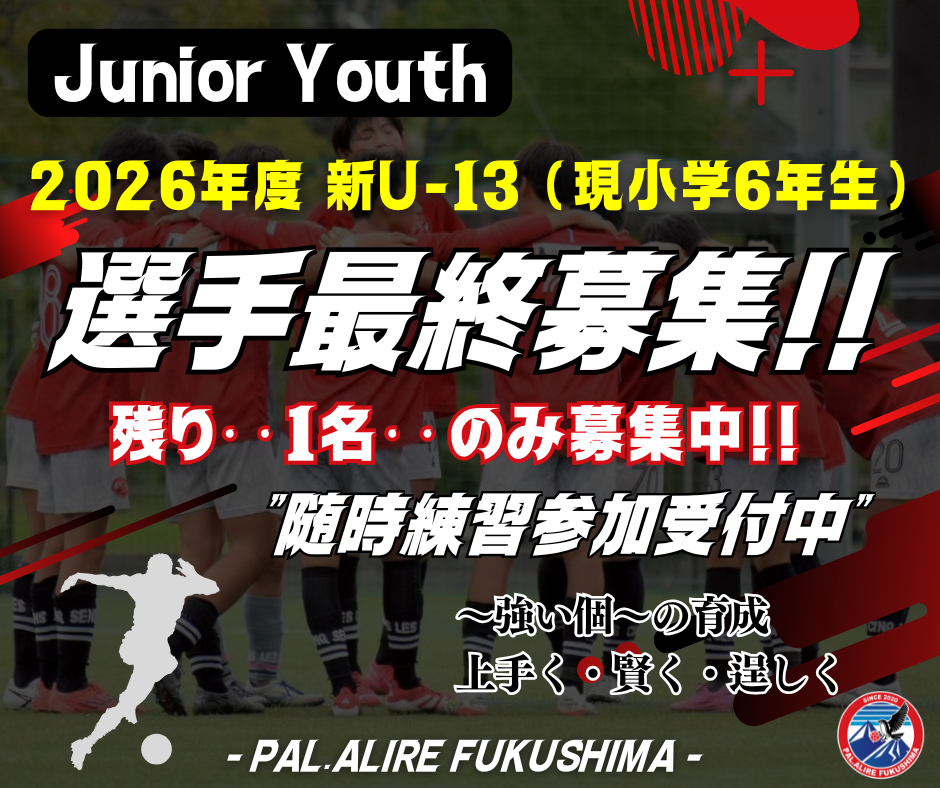 小学生~中学生年代のサッカーの育成・強化及びサッカーを通した福島県のスポーツ文化の創造へ寄与することを目的として活動しております。次世代を担う福島県の子供たちの将来に大きく貢献出来るよう、情熱と覚悟を持って挑戦して参ります。